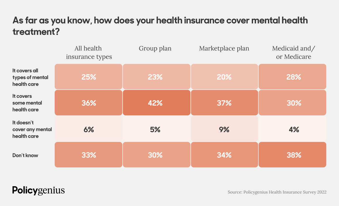 One issue is that many people with health insurance (33%) don’t know whether their plan covers mental health treatment. And while health insurance plans are expected to provide “parity” in coverage between physical and mental health services, the reality is that many mental health practitioners don’t take insurance, [9] as it’s often less cost-effective for the provider.
