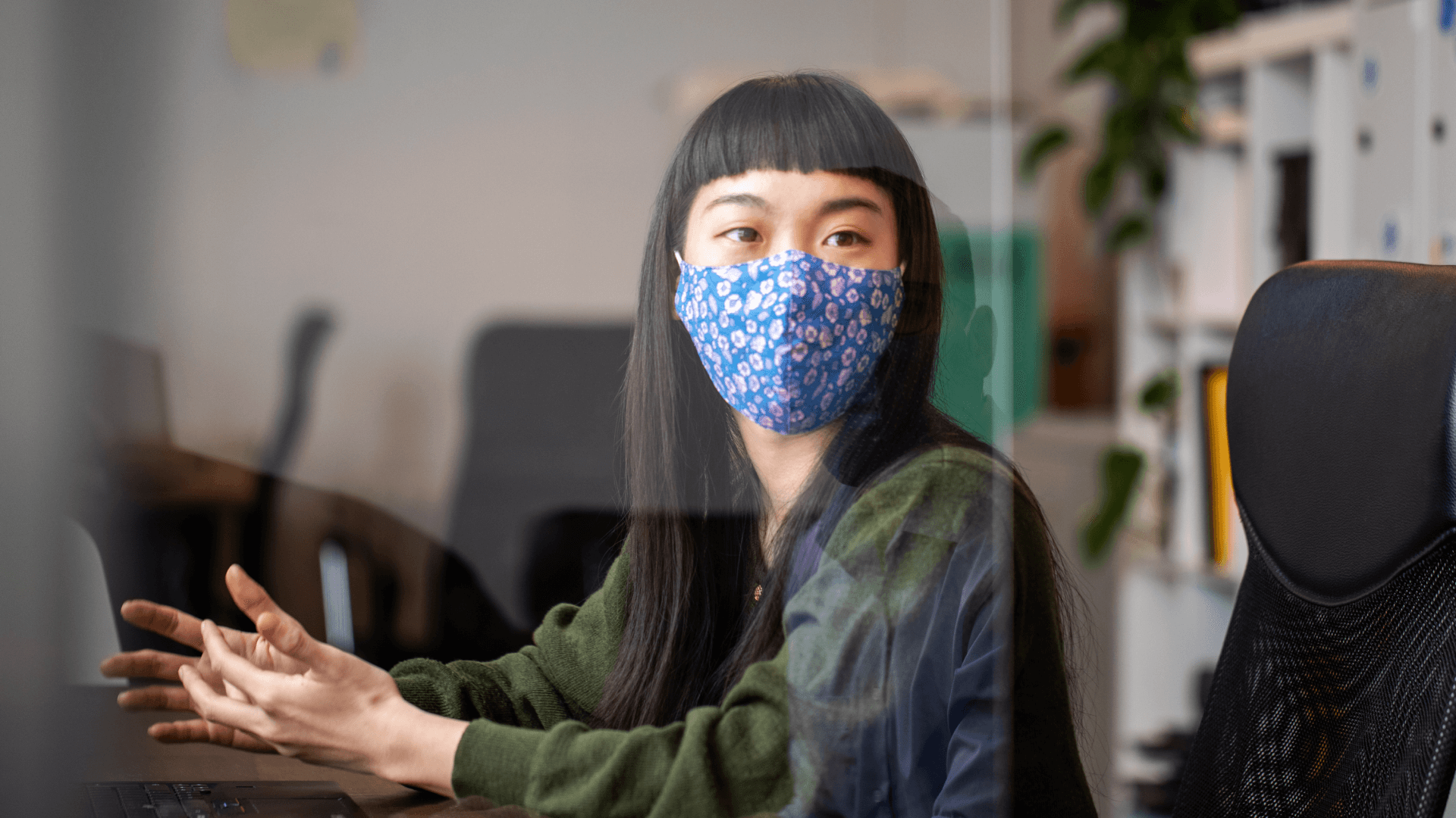 a woman waves at a computer camera